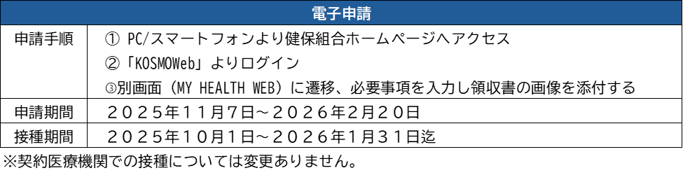 今年度のインフルエンザ予防接種補助金申請(契約医療機関以外での接種)は2025年11月7日より電子申請を開始しました。申請期限に関わらずお早目の申請をお願いいたします。