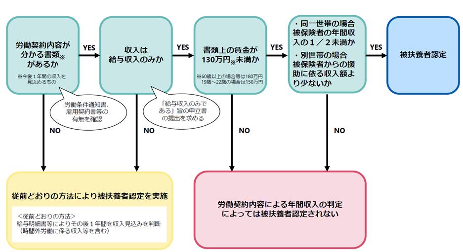 1.労働契約内容による年間収入の判定について、従来の取り扱いに加え、収入が給与収入のみかつ労働条件通知書等の労働契約の内容が確認できる書類(以下、「通知書等」という。)で今後1年間の収入見込みを判定できる場合は、被扶養者取得届の添付書類として提出を可能とします。